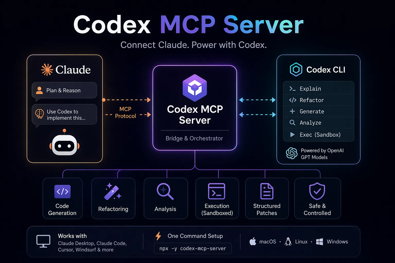 - Expose les commandes Codex (explain, refactor, generate, analyze, exec, etc.) comme des outils MCP structurés