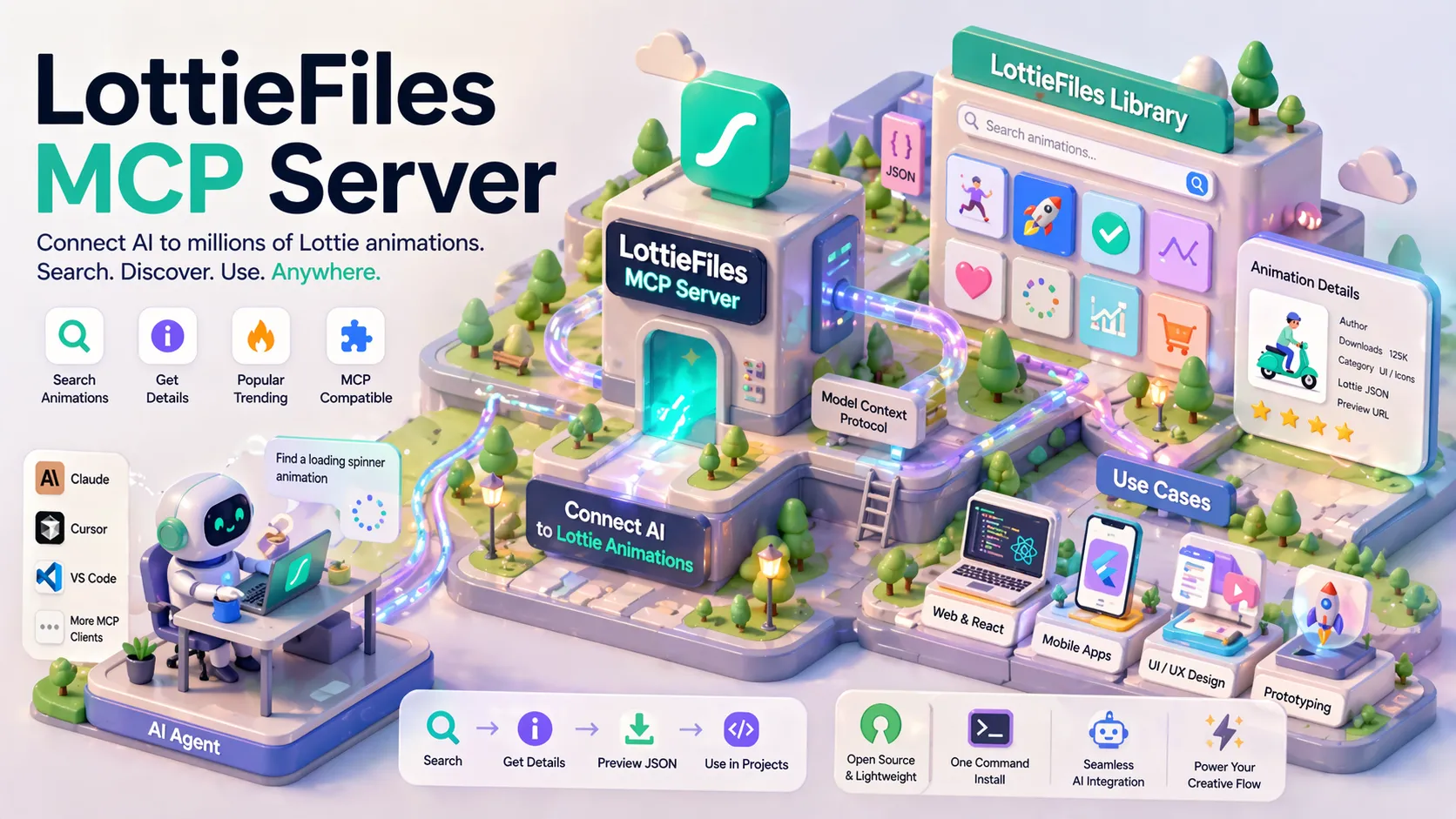 - Design de Movimento Impulsionado por IA: Permita que Claude ou Cursor busquem animações Lottie existentes e as incorporem em protótipos de UI, sites ou aplicativos.