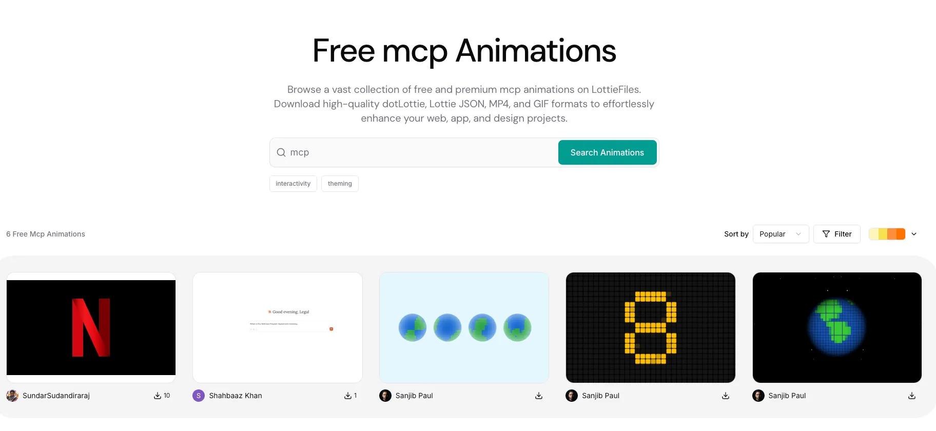 - Buscar Animação: Consultar o banco de dados da LottieFiles usando palavras-chave ou descrições. -K. Obter Detalhes da Animação: Recuperar metadados abrangentes, incluindo informações da estrutura JSON, autor, downloads, categorias e URLs de pré-visualização.